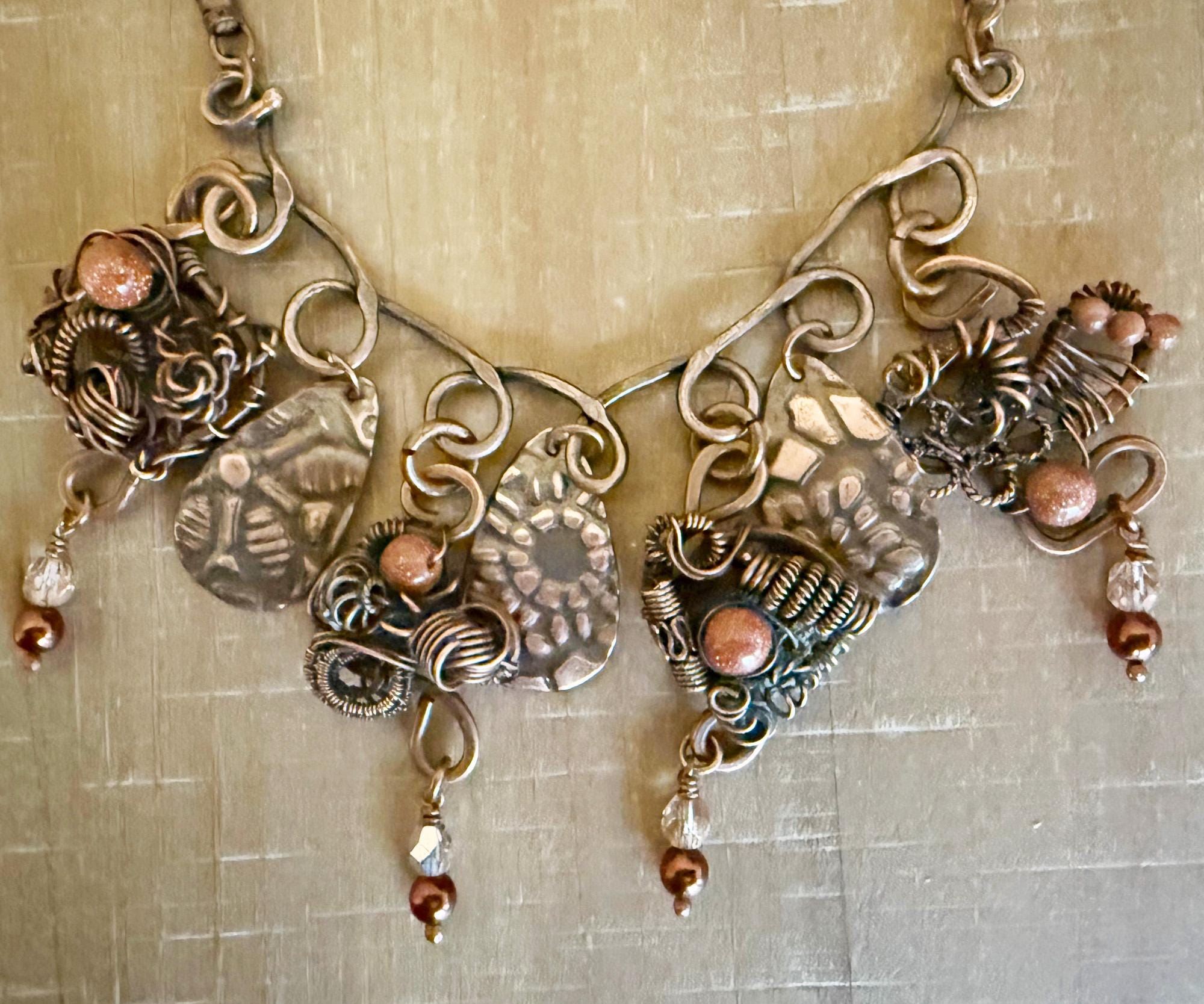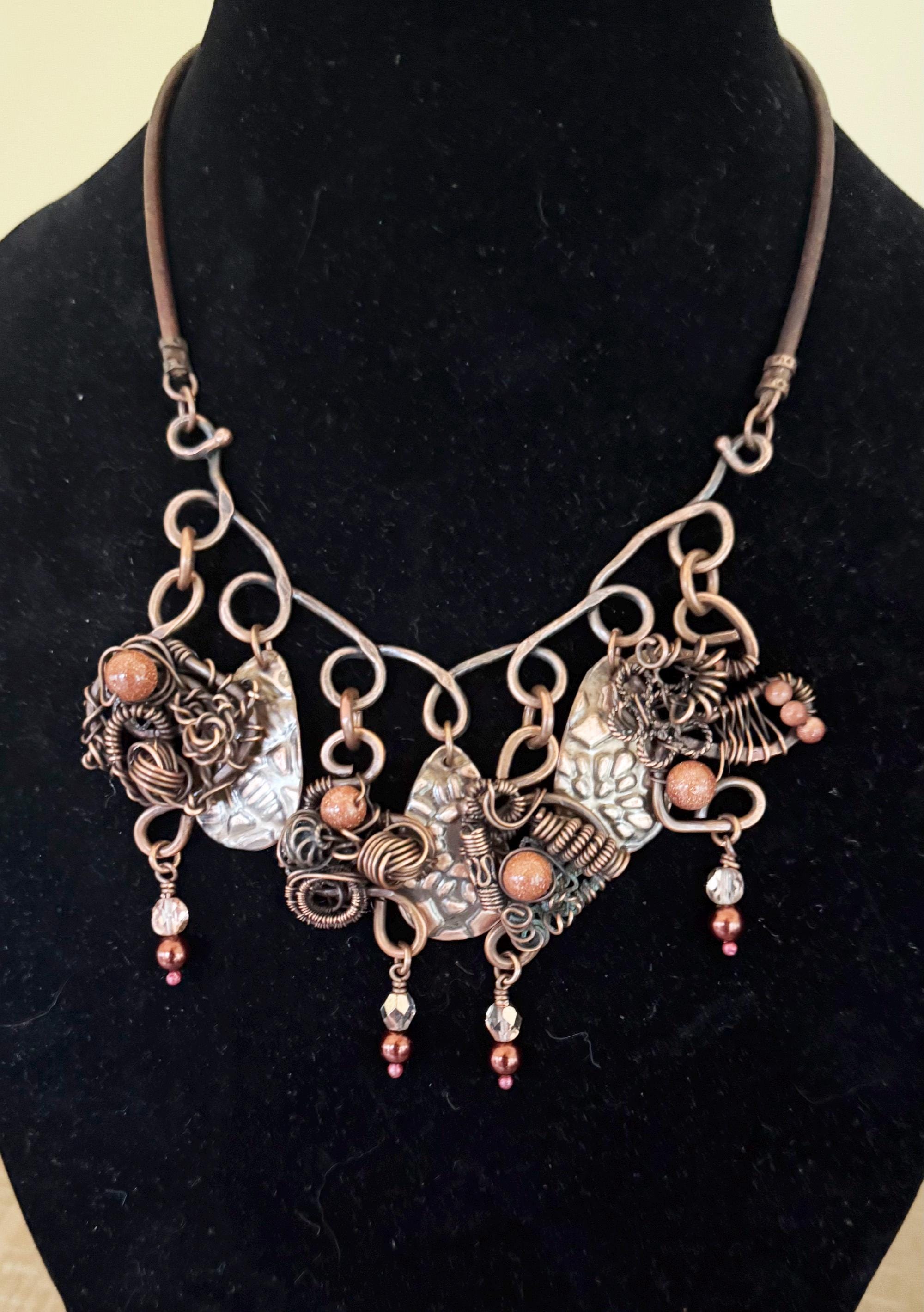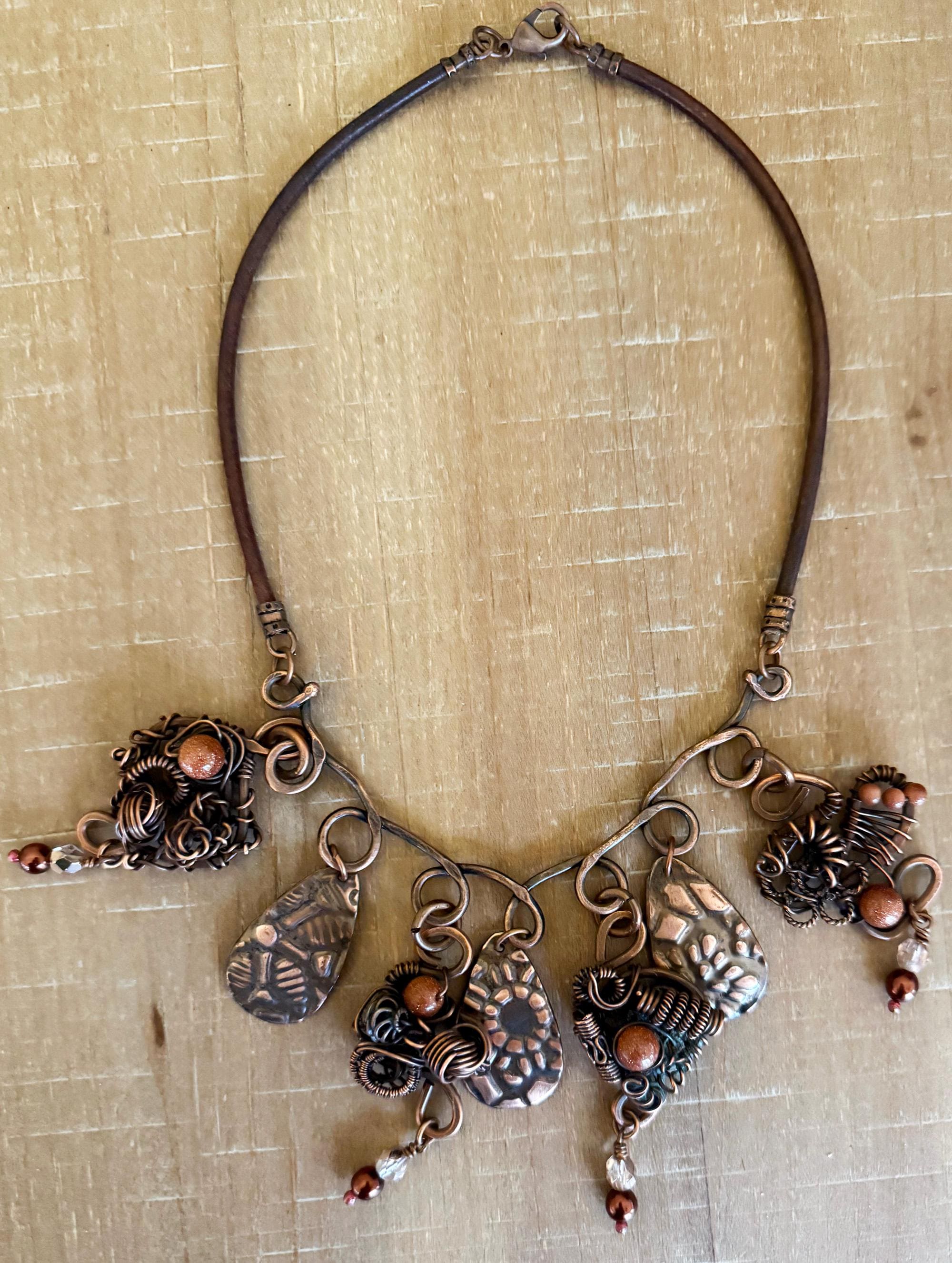 This is a one of a kind bib necklace handmade from various sizes of copper wire. There are four hand cut teardrop pieces that have been embossed with a rolling mill. Then there are four crazy wired additional pendants which have handmade wired knots and coils along with Gold Stone beads, crystal beads and copper colored glass pearls. The bib necklace is 4 inches wide and the pendant drop is 1 1/4 inches to 2 1/2 inches long. The necklace is finished with 3mm dark brown natural leather cord measuring 16 inches in length.