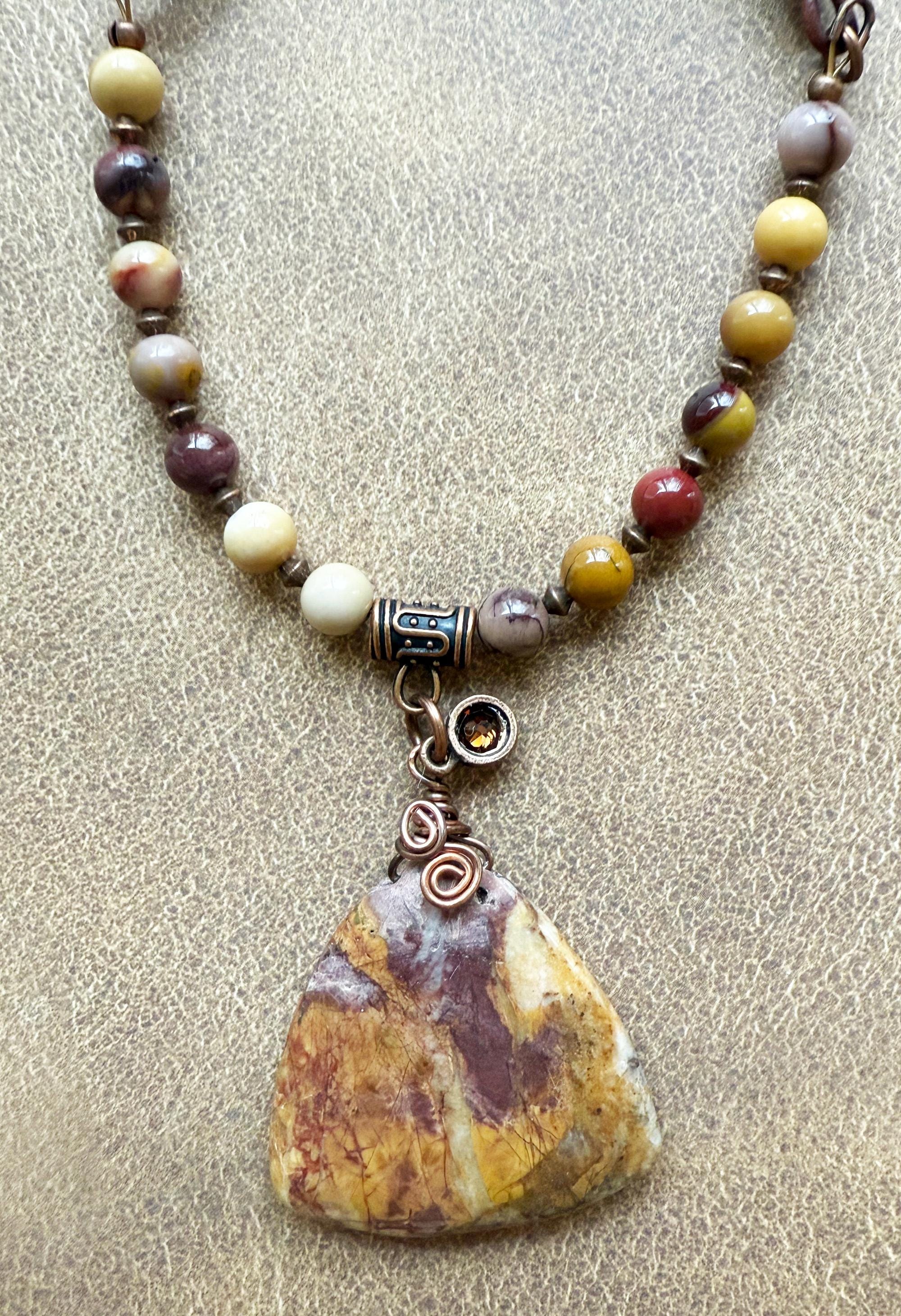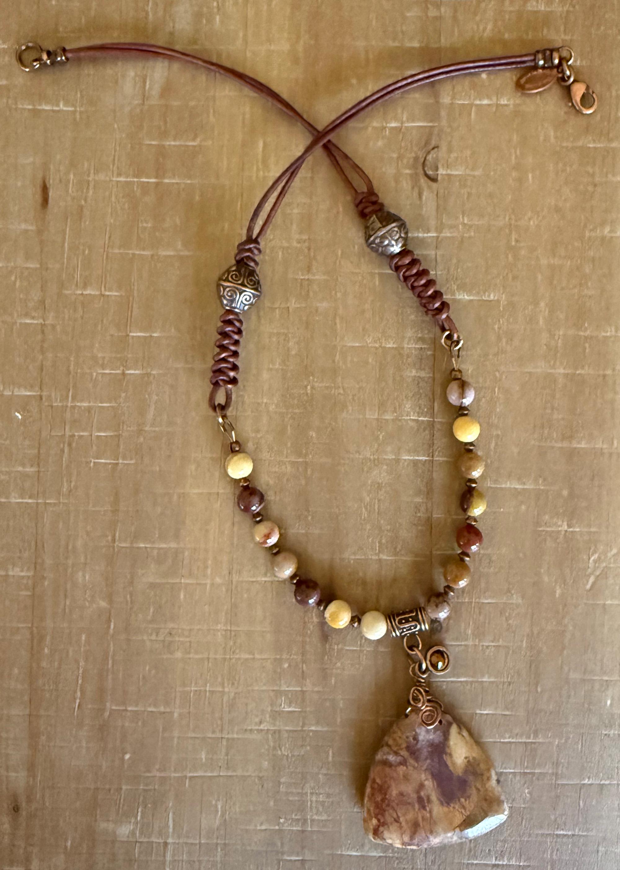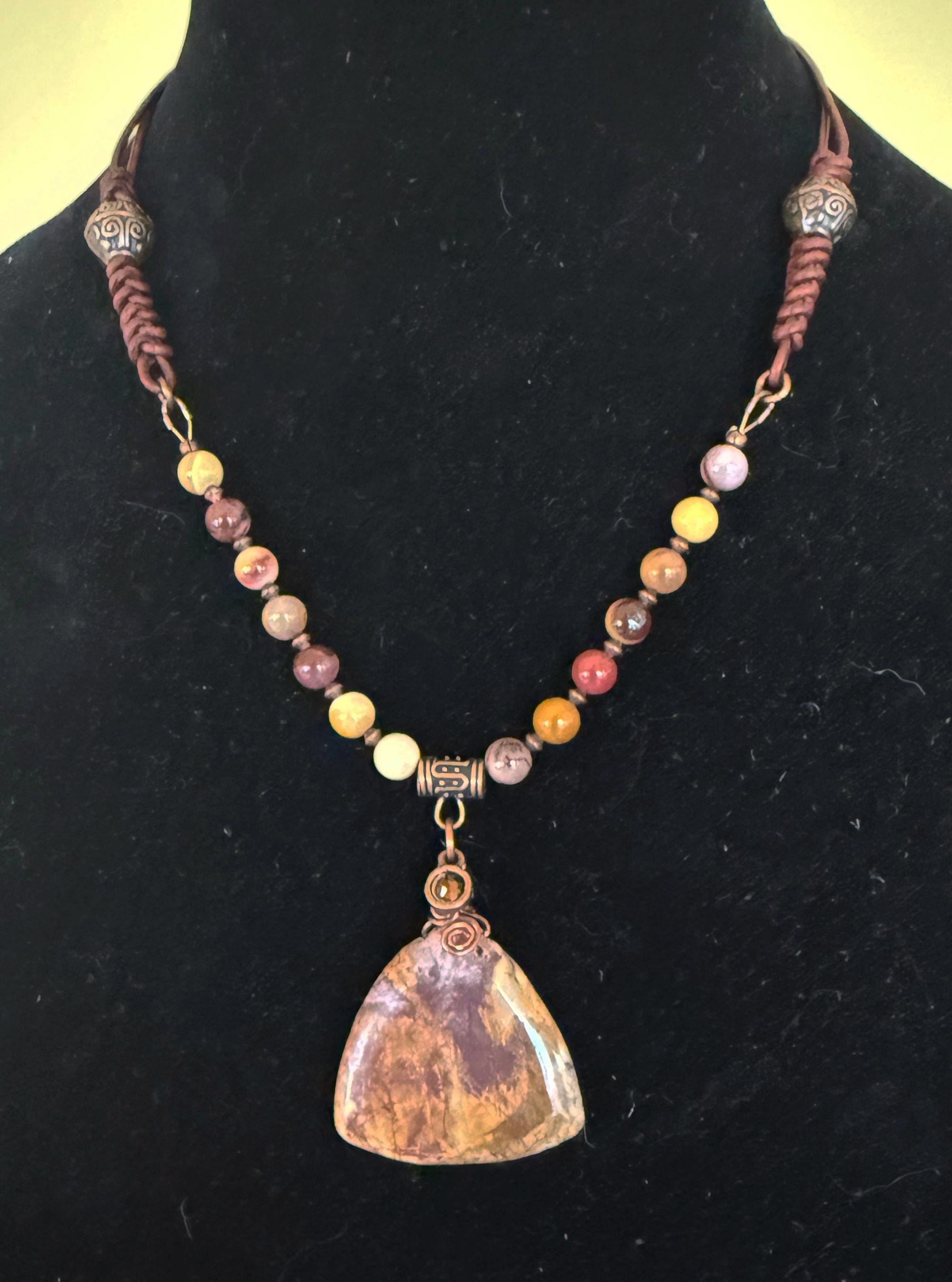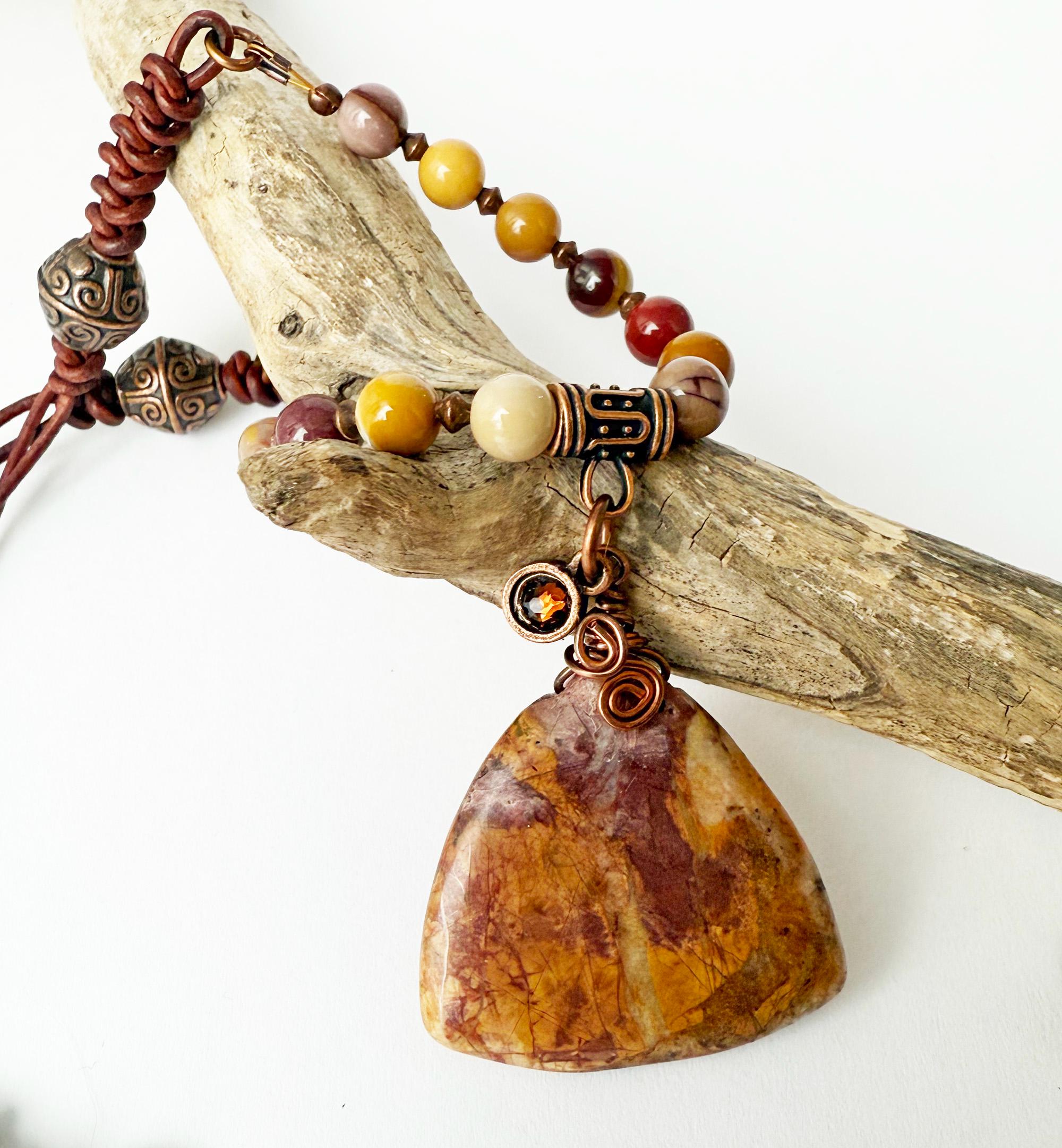 This is a Red Creek Jasper Pendant accented with a small copper crystal charm. It measures 1 3/8 inches x 1 3/8 inches. I have added it to a strand of 6mm Mookaite Jasper beads with small copper bead spacers. There are rich colors of rust, yellow and beige. I have used 1mm reddish brown natural leather cord tied with Spanish Knots and accented with copper beads.