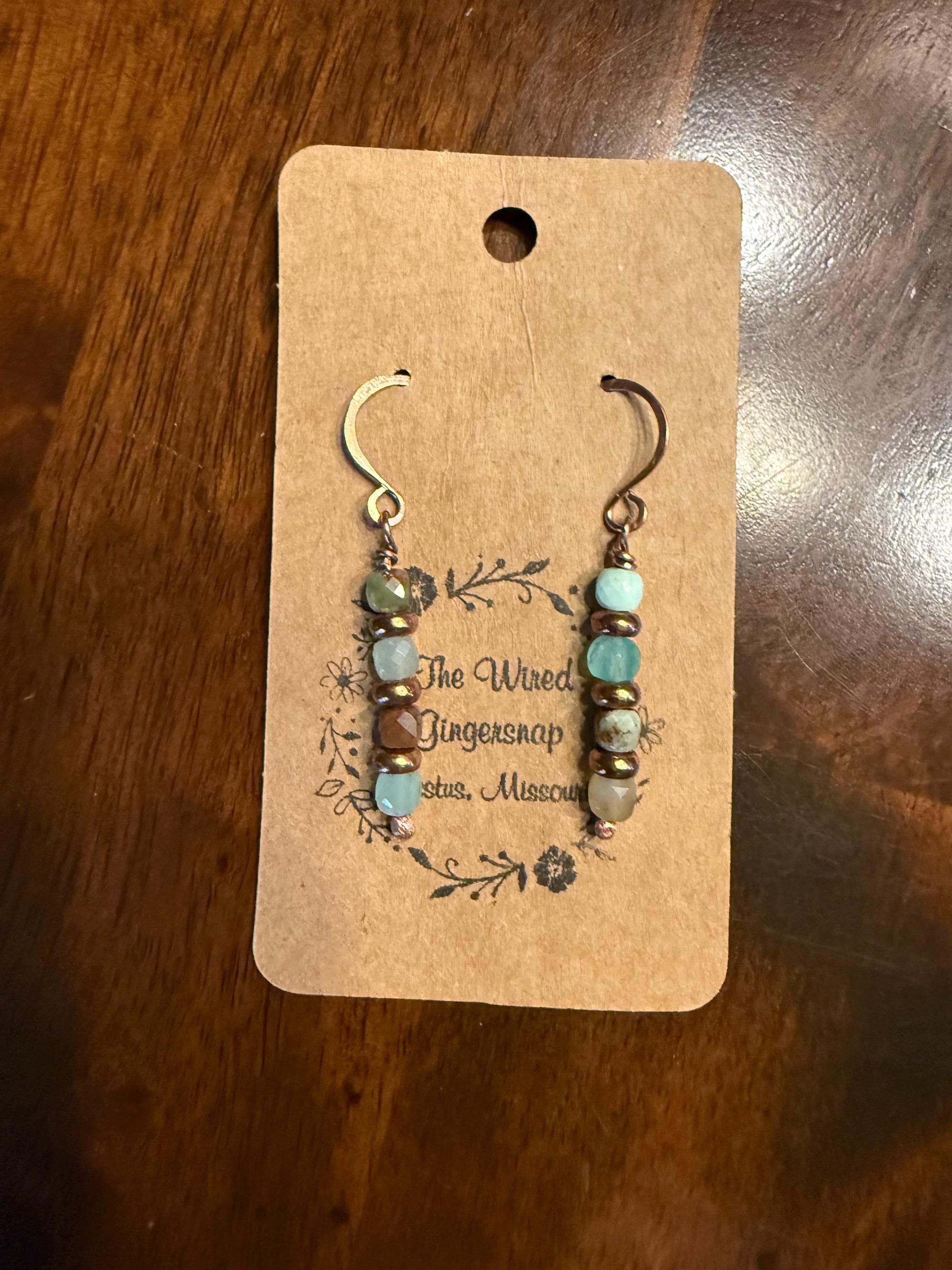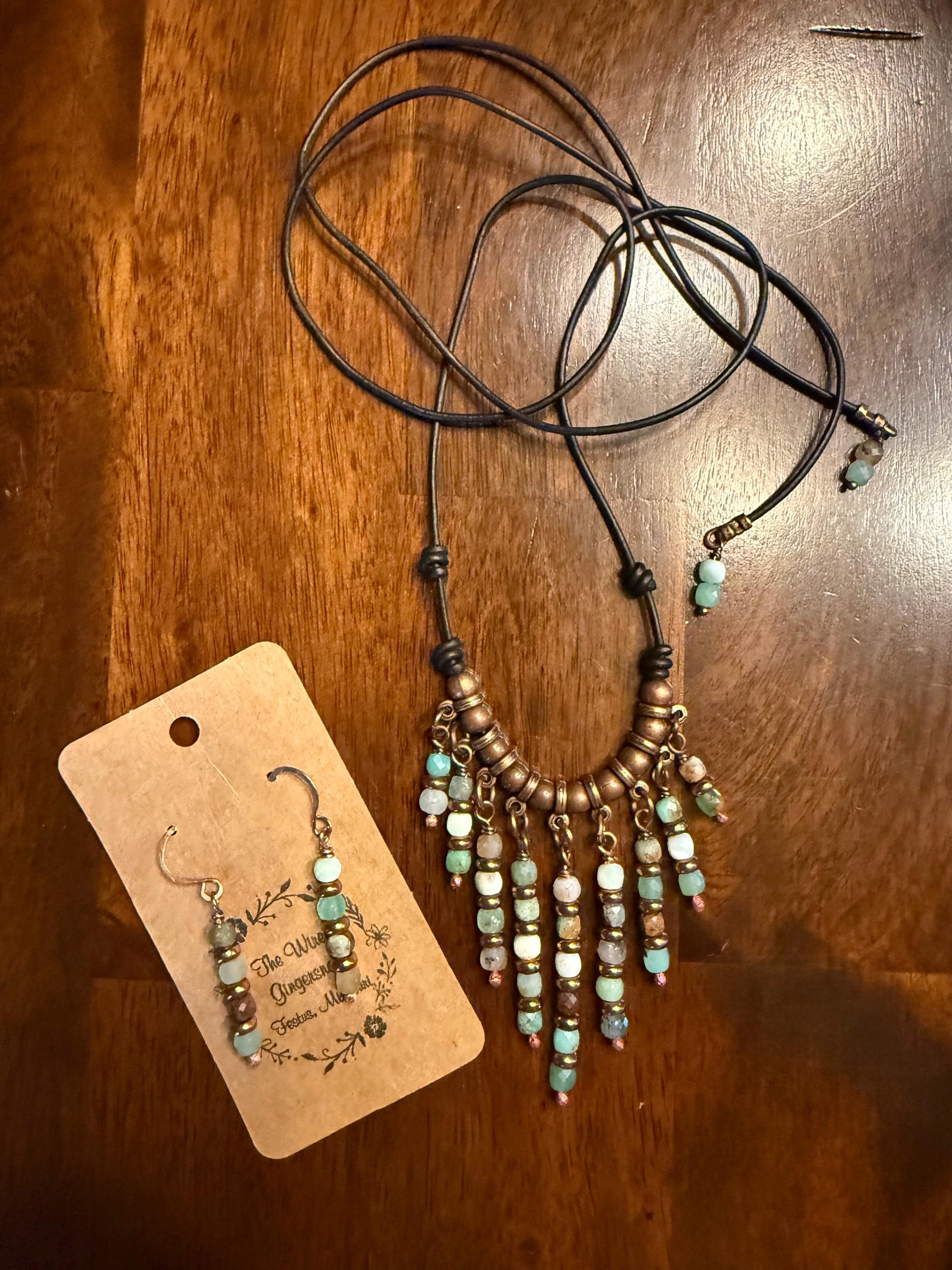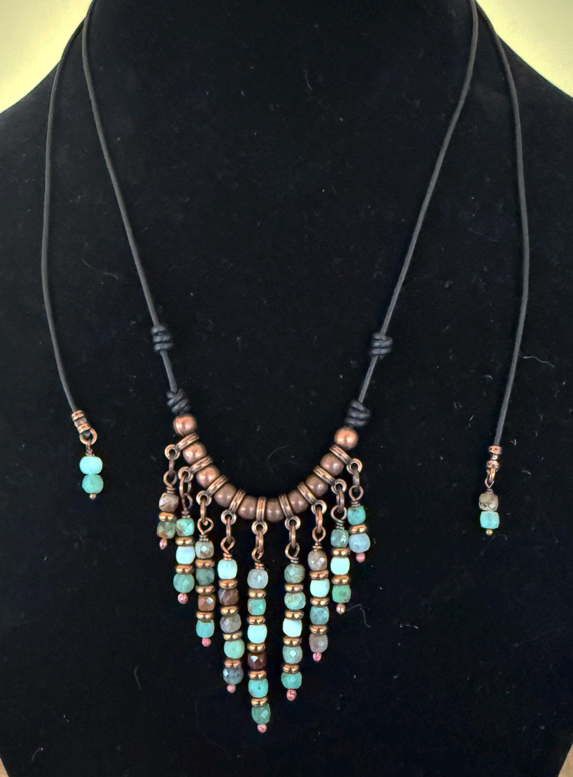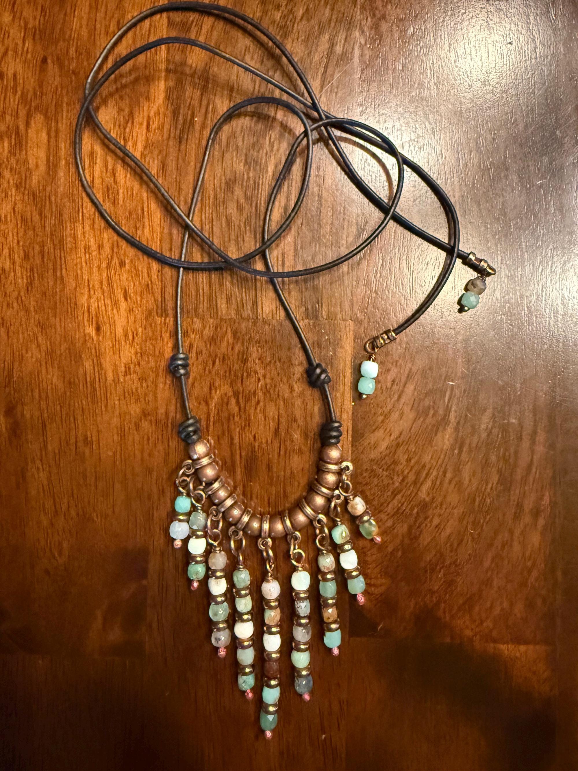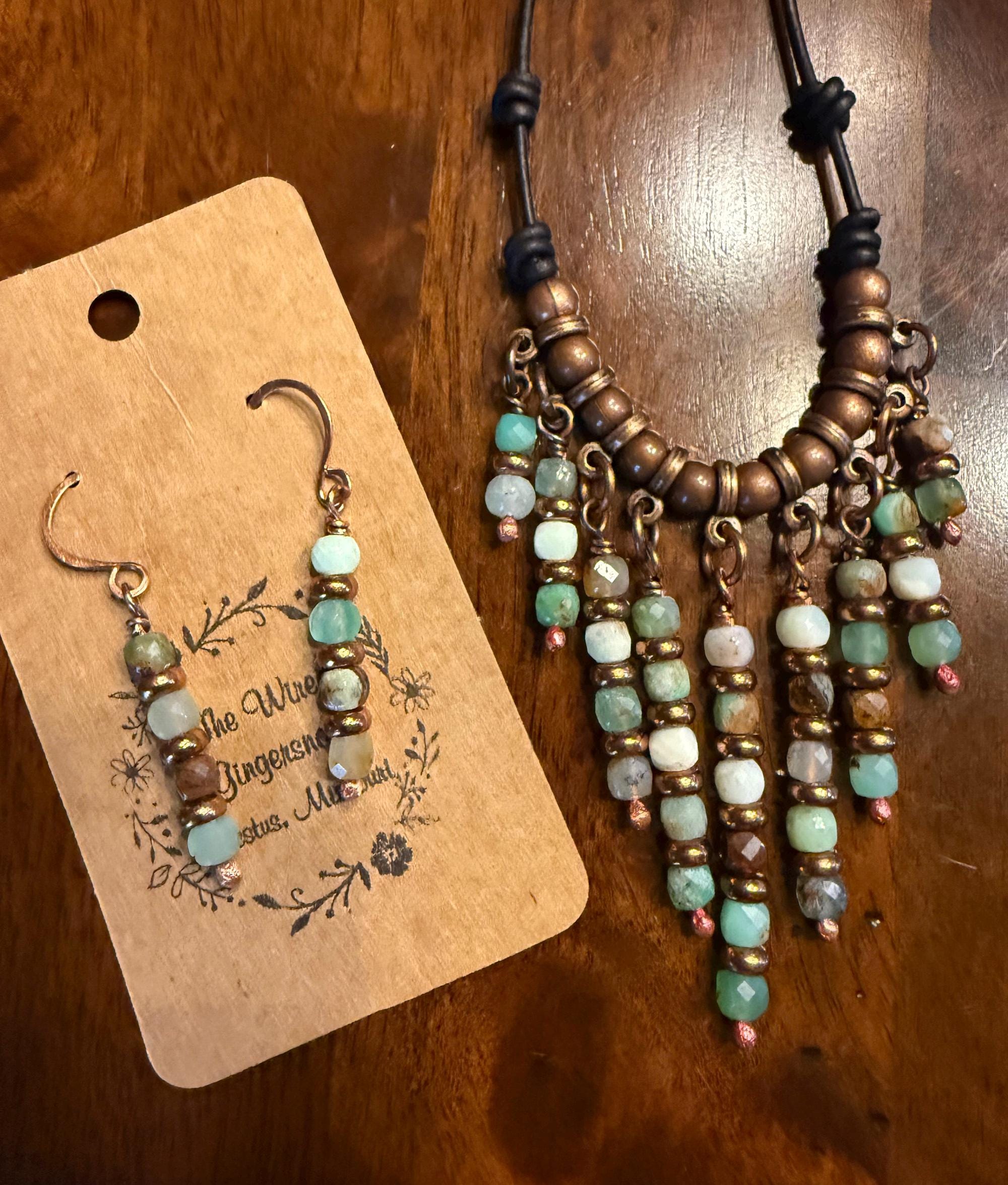 Chrysoprase is a chalcedony stone with a bright spring green color and was once called the Stone of Venus. I have used small 4mm faceted Chrysoprase beads. They hang in graduated length from a section of copper beads and spacers on leather cord. The longest pendant drop is 2 inches with the shorter drop being 3/4 inches. I have used black 1.5mm leather cord and finished the ends with copper crimps and Chrysoprase beads. The length of this necklace is 38 inches long allowing it to be adjusted from short to long. I have also created matching Chrysoprasedrop earrings measuring 1 1/4 inches long.