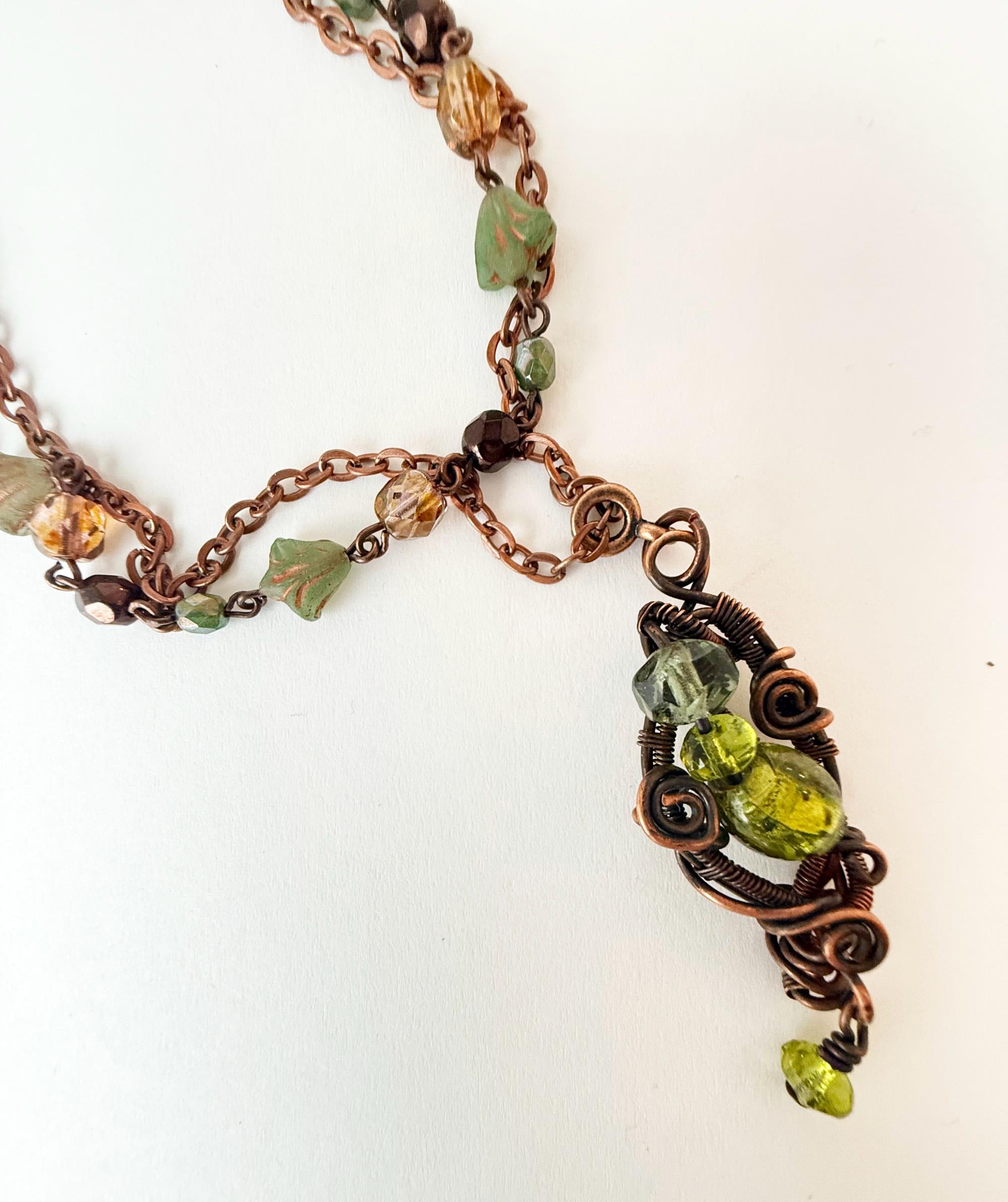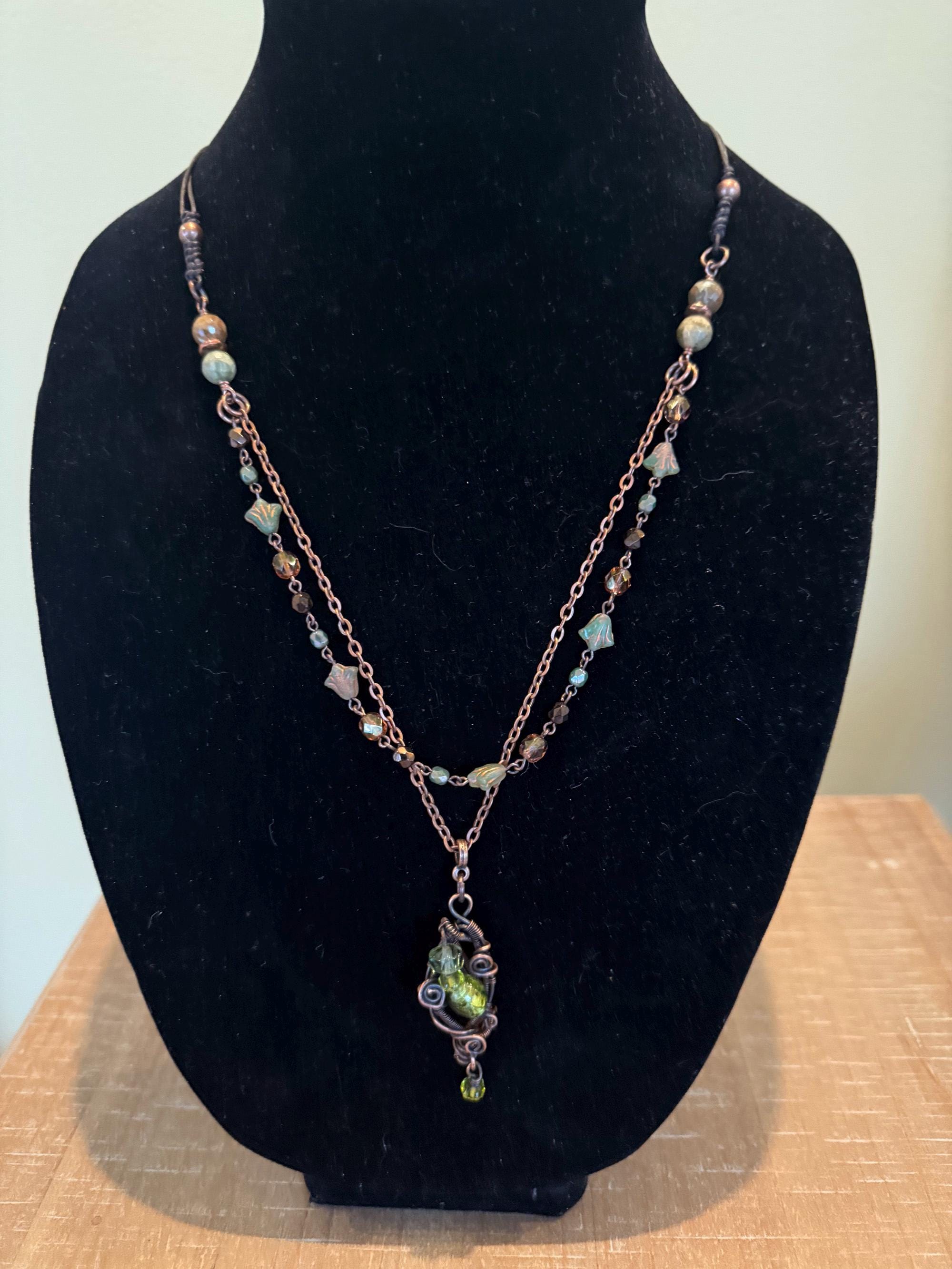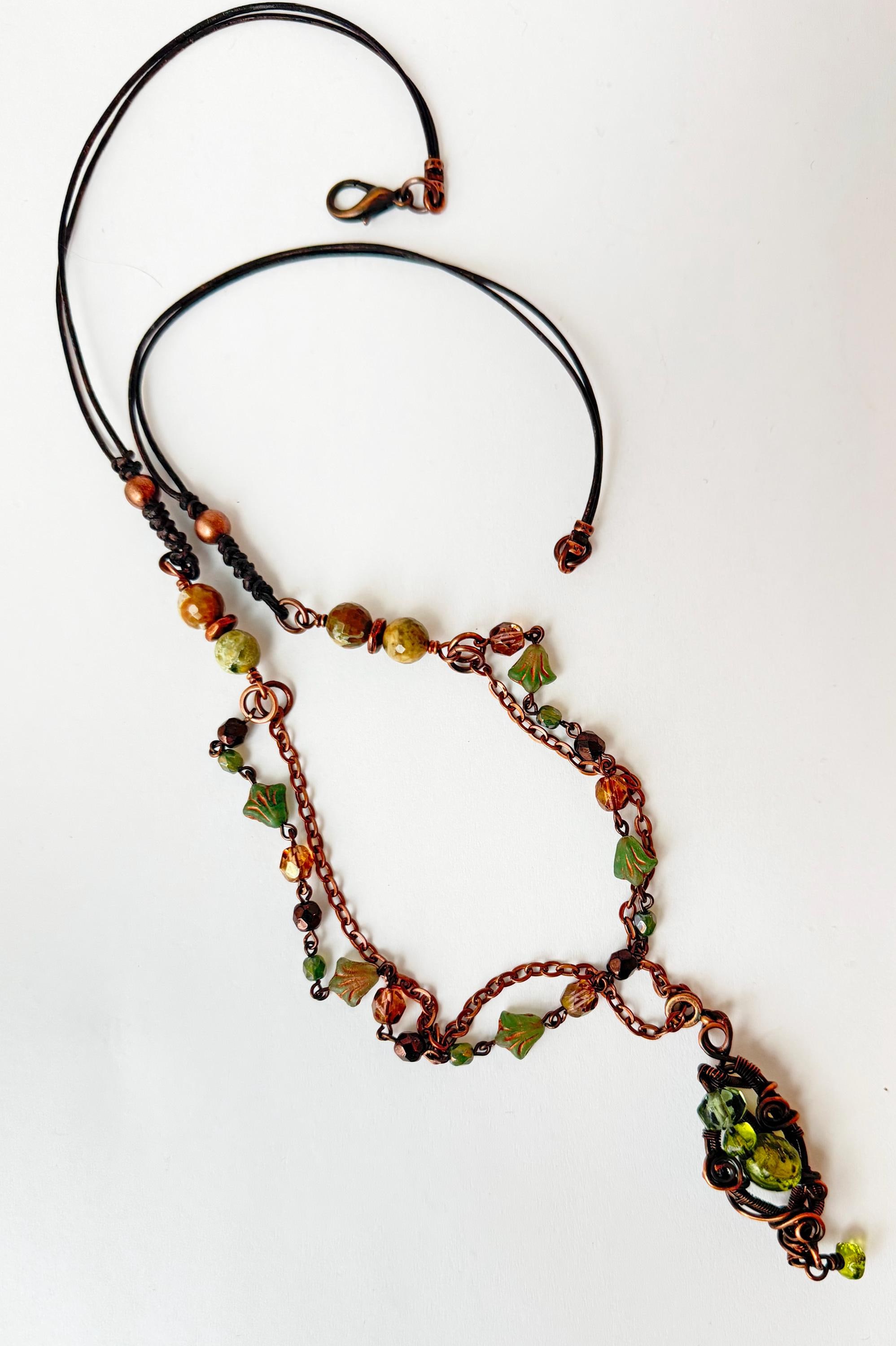 I have created a wire woven pendant using green lamp beads and faceted glass beads. I then added a dangling glass bead at the bottom of the pendant. I have added the pendant to a section of copper chain. I then used a section of Czech glass tulips and faceted glass beads. Both of these pieces are joined to a handmade spacer consisting of two 8mm Rhyolite beads. I then finished the necklace with dark brown natural leather cord which I tied with Spanish Knots and then added copper beads.