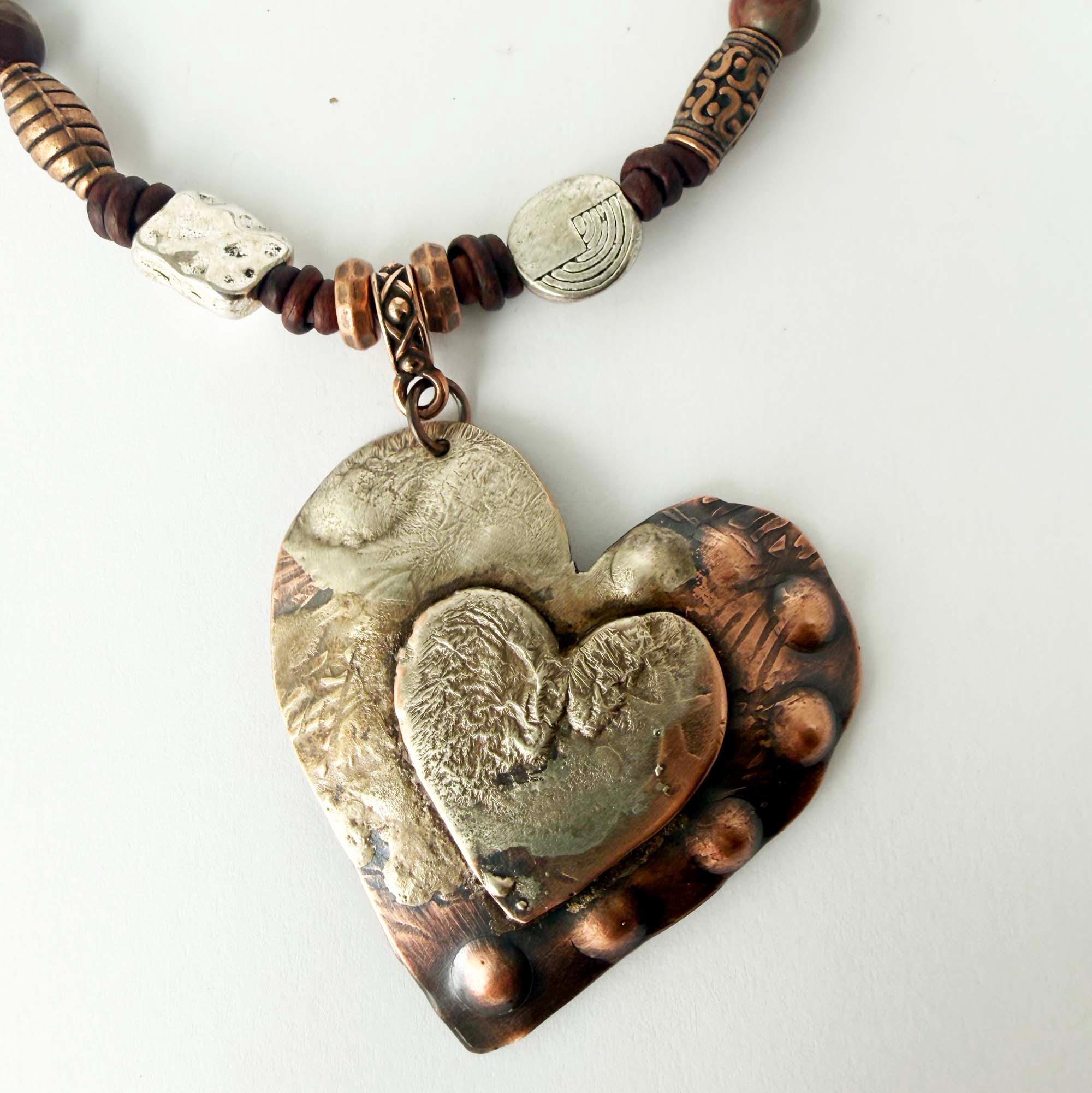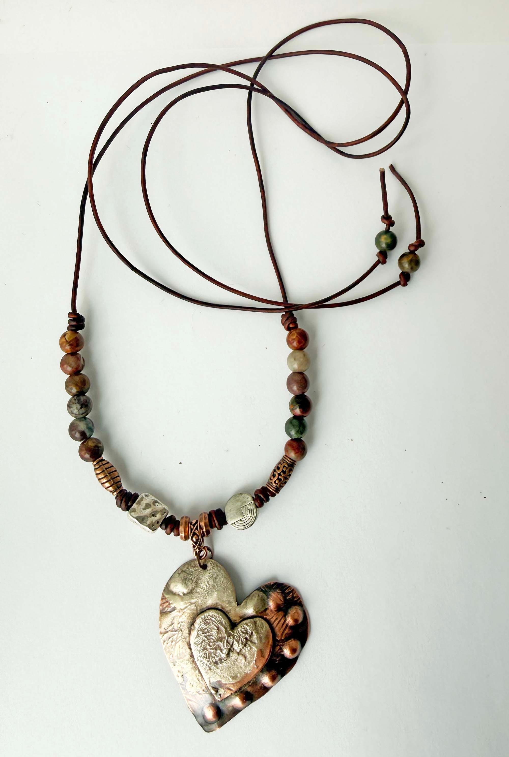 A fun necklace to add to your jewelry collection....This one is copper which began with large and small hand cut hearts. They have been textured and soldered together. I then melted sterling silver over a portion of the hearts and added a little more texture. This pendant has been oxidized and given a clear coat of jewelry lacquer to protect the finish. The heart measures 1 3/4 inches x 1 3/4 inches. I have added the heart to a strand of natural dark brown 1.5mm leather cord accented with Red Creek Jasper beads. The overall length of this necklace is 45 inches and can be adjusted to various lengths from short to long.