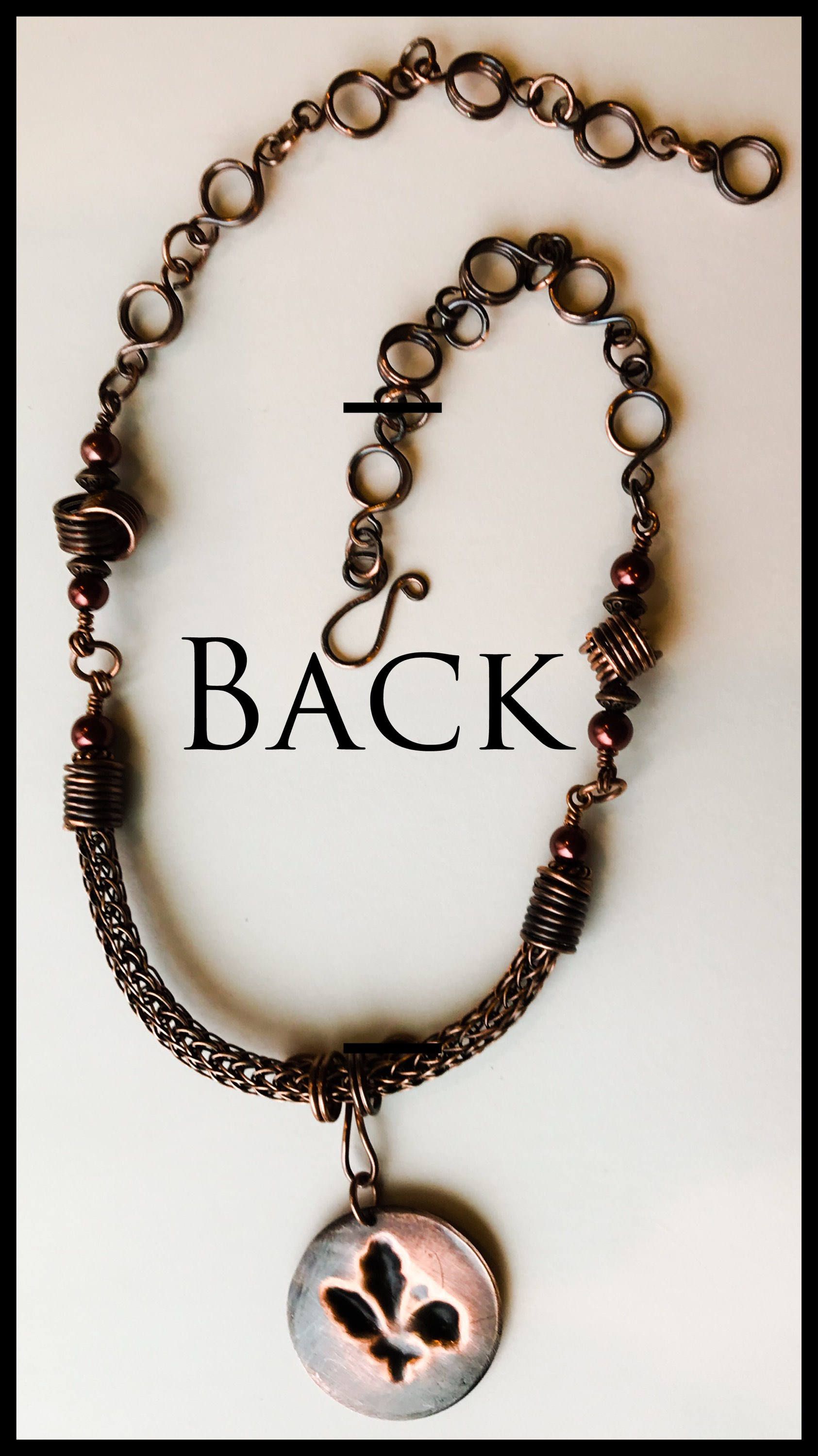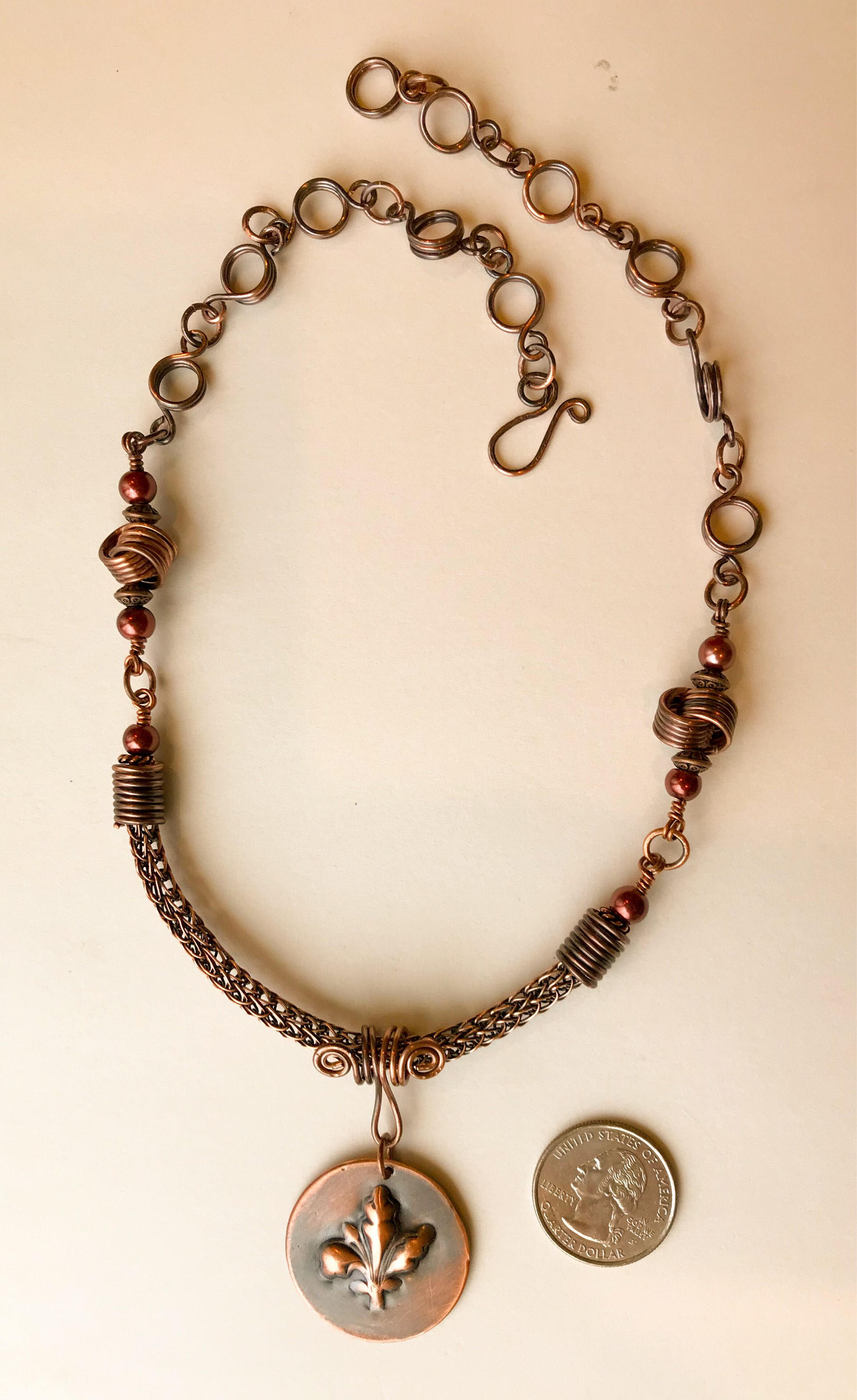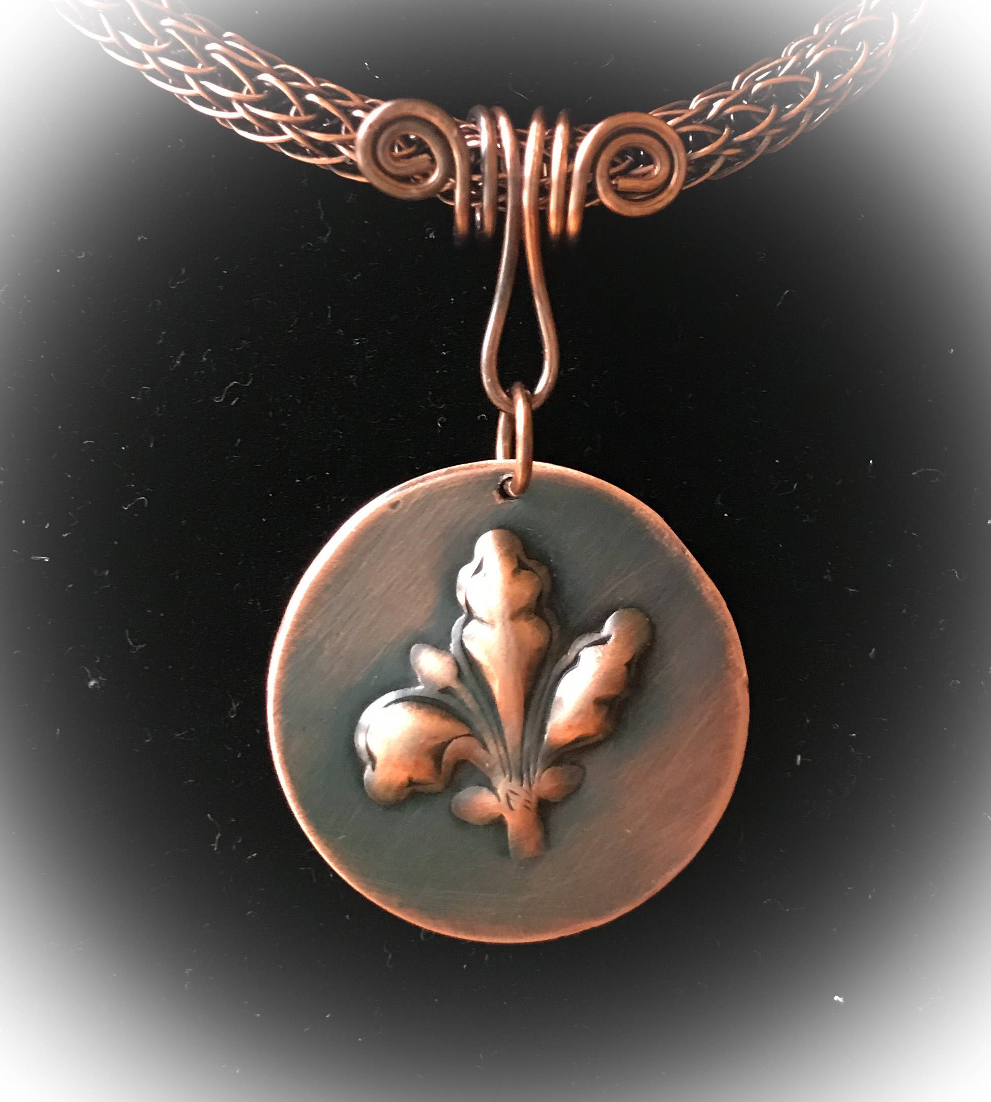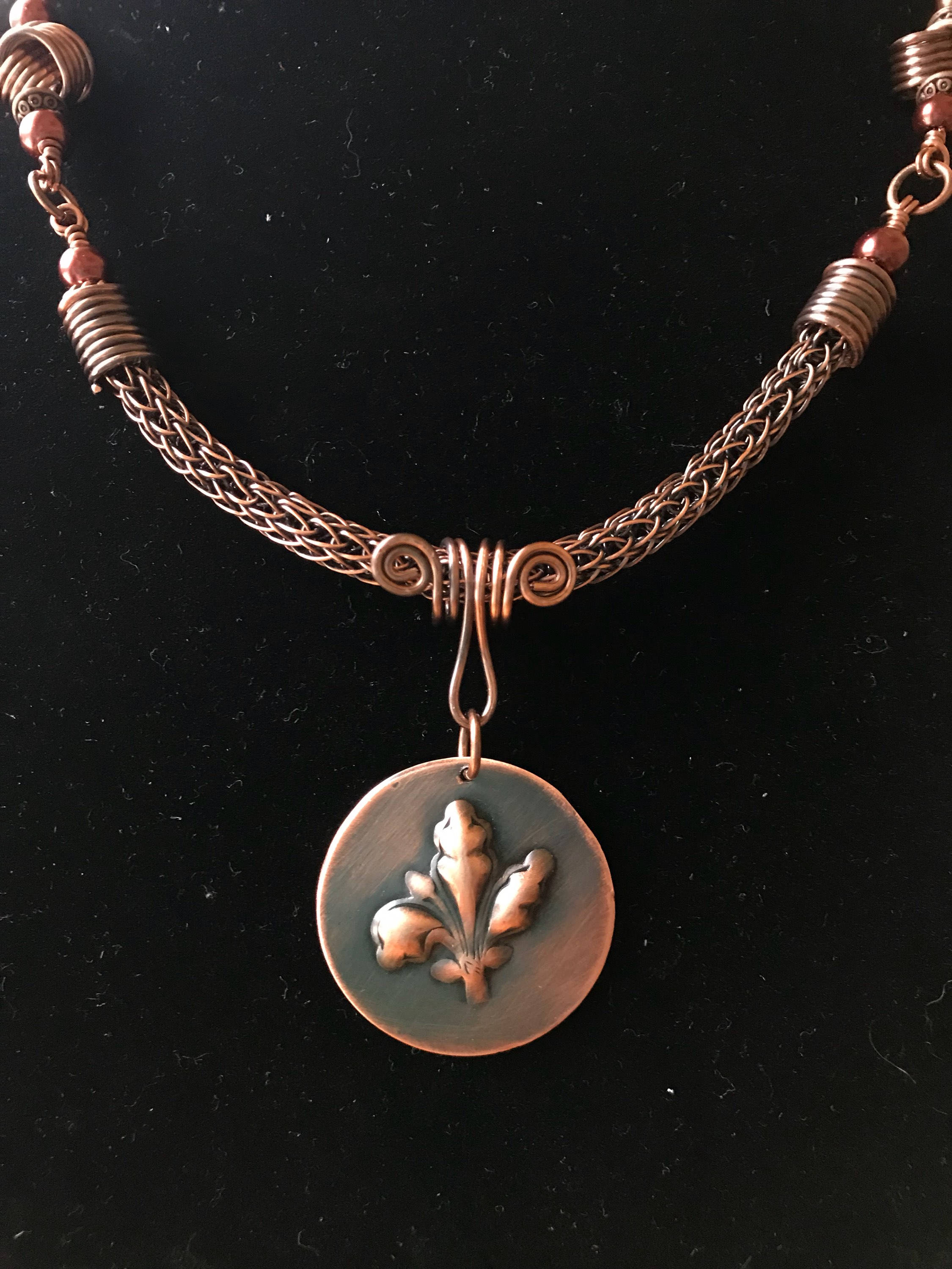 This a handmade piece of jewelry made from copper wire woven by me and a handmade chain. The pendant is created from copper sheet metal. I annealed the metal and added a Fleur de Lis impression.