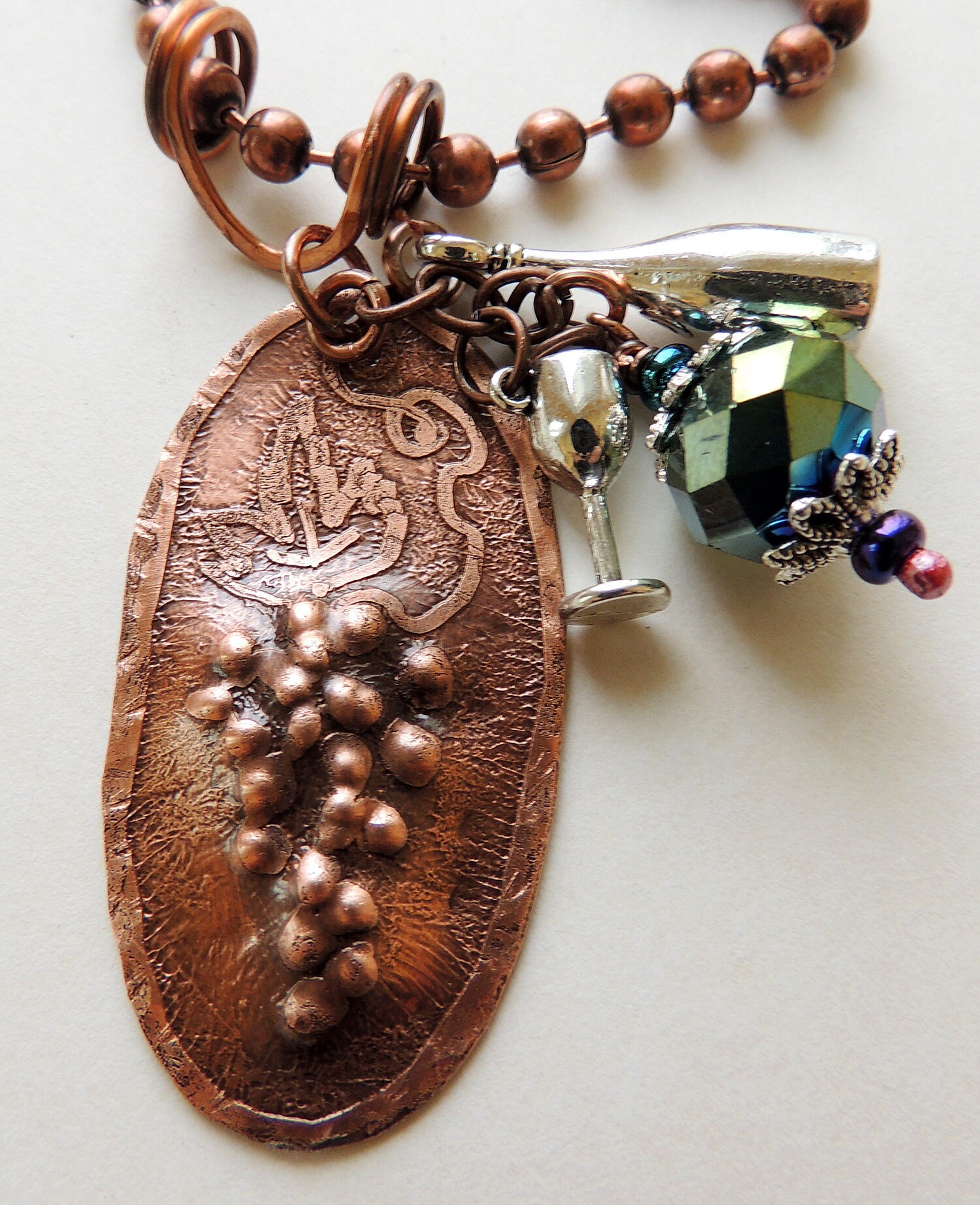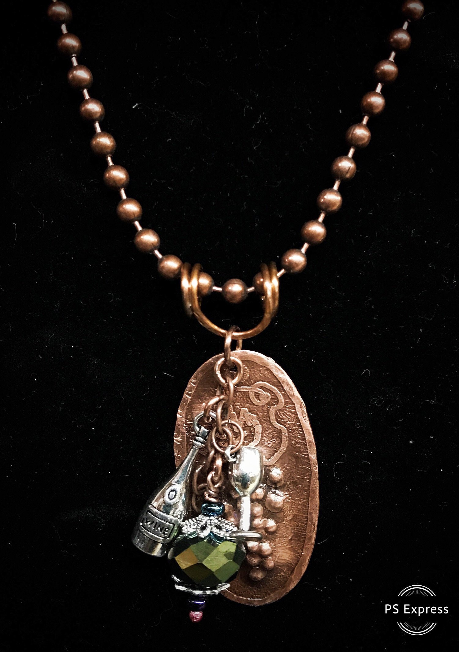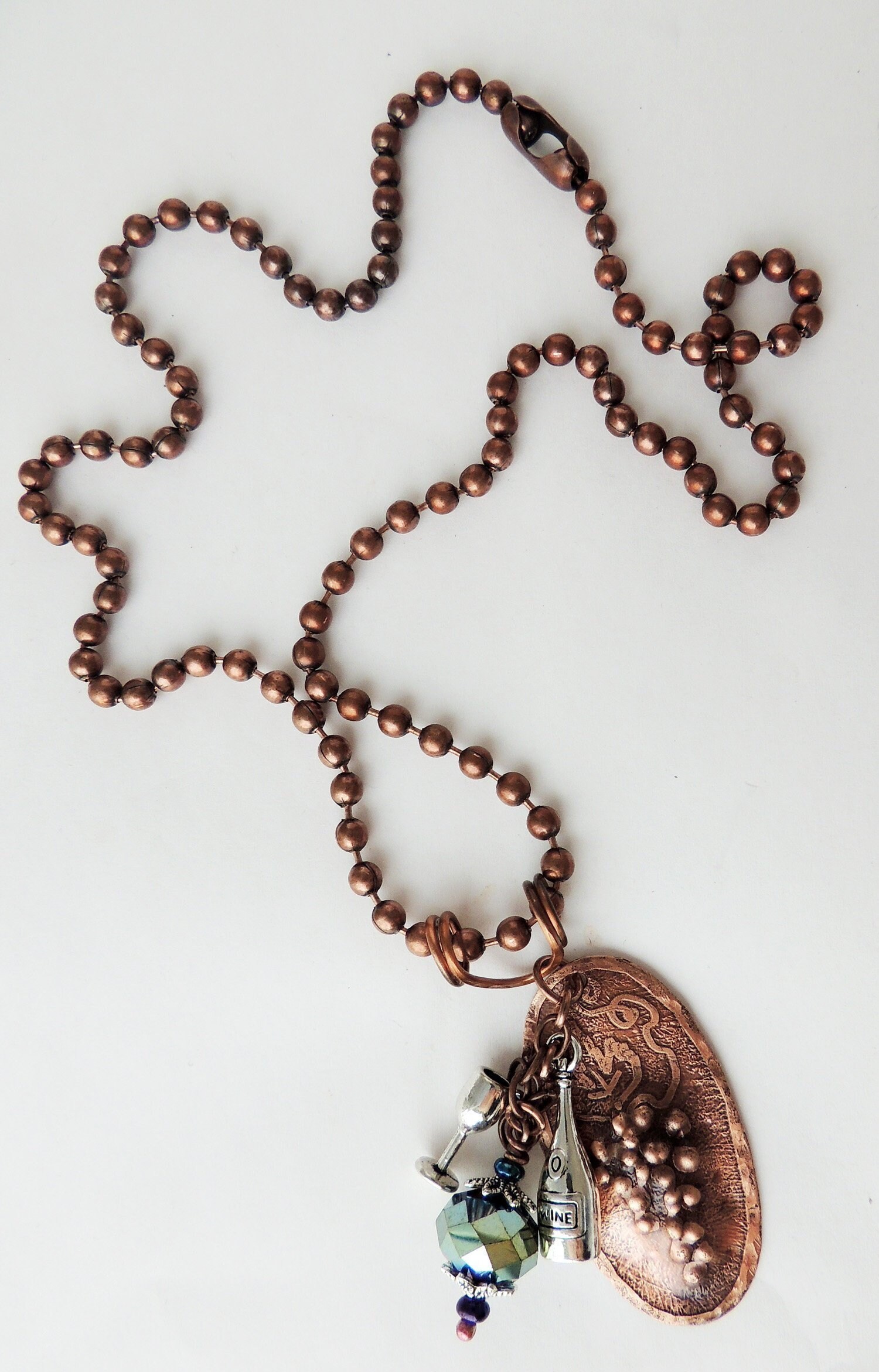 This is a fun piece of jewelry for the wine lover. I began with a sheet of copper and hand cut an oval shape. I then created my grapes by hammering the design and texture. I then drew my leaf and vine and placed the pendant in an etching solution. Afterwards I gave it an oxidized patina and a jewelry lacquer coating to protect the patina. I added a glass bead with silver embellishments and a wine bottle and glass charm. The pendant is 2 inches x 1 inch.