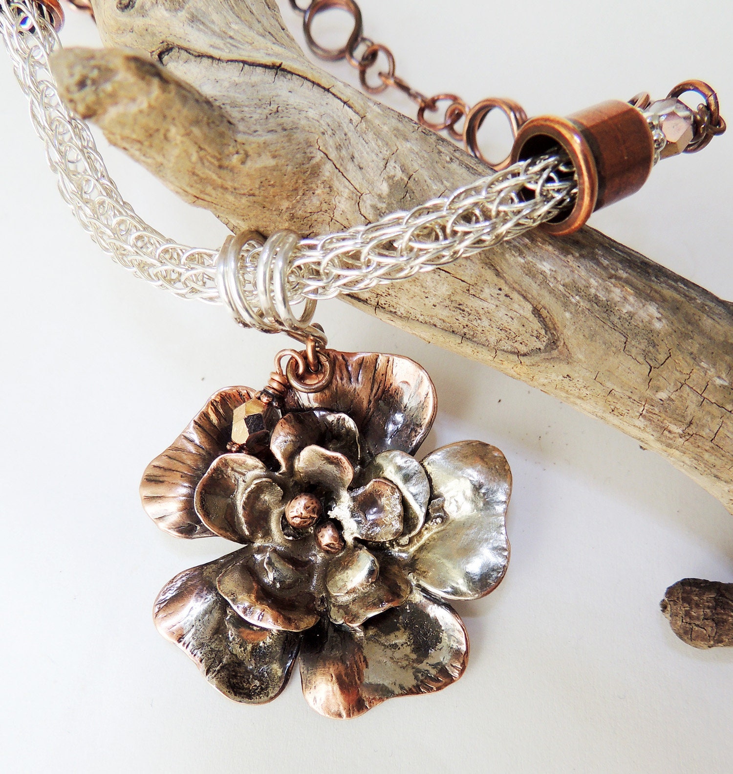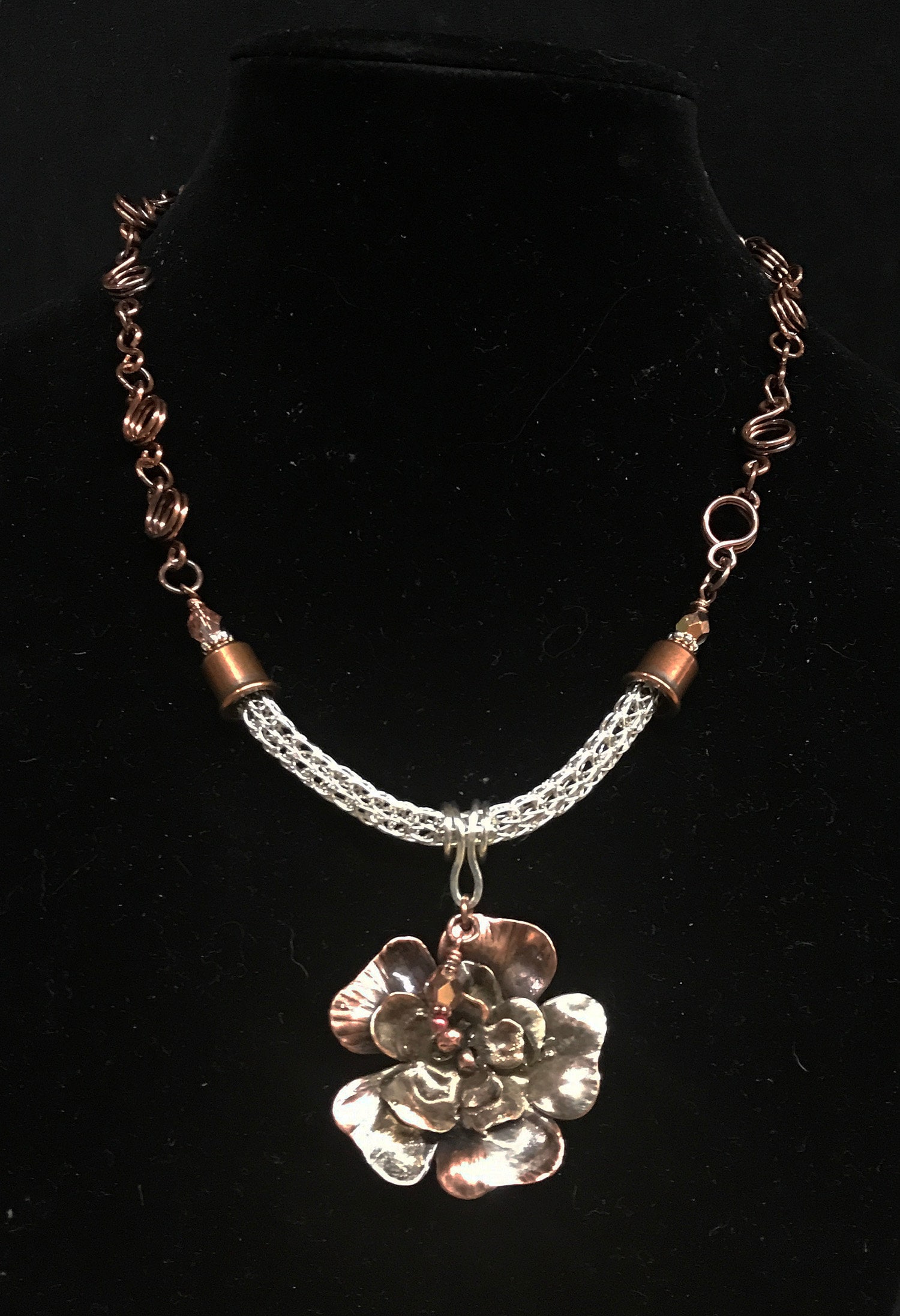 A mixed media of sterling silver and copper was used to create this necklace. I began by hand cutting the flower layers from copper sheet metal. The flower has been hammered and shaped to give it depth and contrast. I then used a technique called reticulation and melted Sterling Silver over parts of the copper flower. I then gave it an oxidized patina and polished the flower after which I coated with a protective jewelry lacquer to preserve the patina. I placed this pendant on a section of sterling silver viking knit that I wove and added this to a handmade copper chain consisting of circle and figure 8 links.